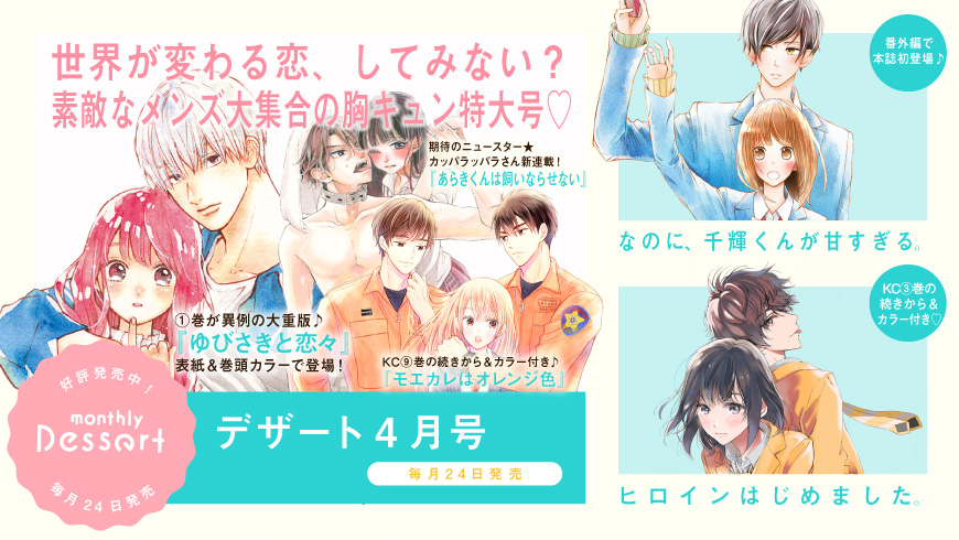 【デザート4月号発売中】表紙&巻頭カラーは、①巻が大重版中の『ゆびさきと恋々』♪ 『なのに、千輝くんが甘すぎる。』も本誌初登場&カッパラッパラさんの新連載★ 史上最厚で最熱の776P! -