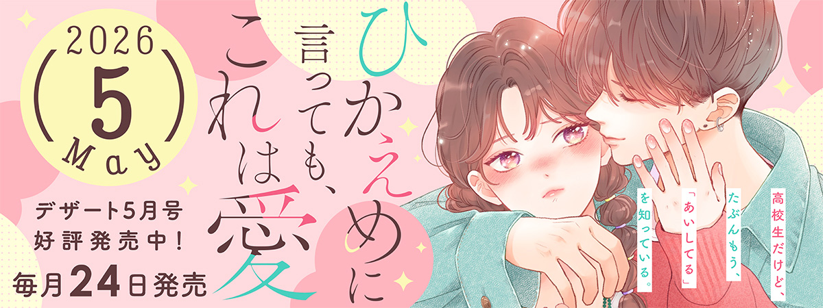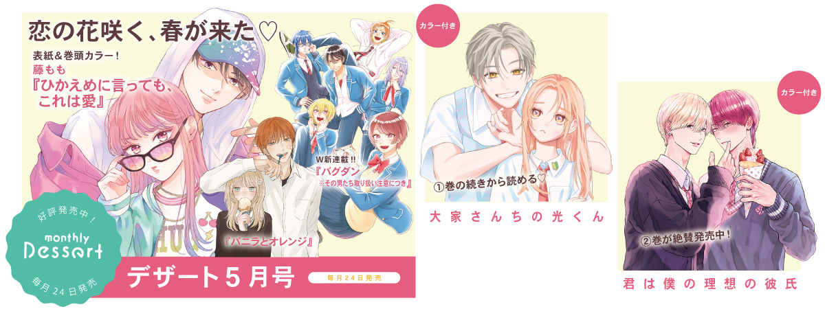 【デザート5月号✦本日発売】表紙&巻頭カラーは、『ひかえめに言っても、これは愛』が登場! さらに最新刊が話題沸騰中の『大家さんちの光くん』『君は僕の理想の彼氏』がカラー付きで連載再開☆彡 『ヒプノシスマイク』百瀬祐一郎さんが原作の『バグダン※その男たち取り扱い注意につき』&甘木あずきさんが描く、へんてこな恋『バニラとオレンジ』の2作品がスタート! 春凪りぐさんのショート新連載『恋する会長はめんどくさい』や、赤池うららさんの新作読み切り『卒業の日、青になった恋』にも注目!!!26/03/24New!