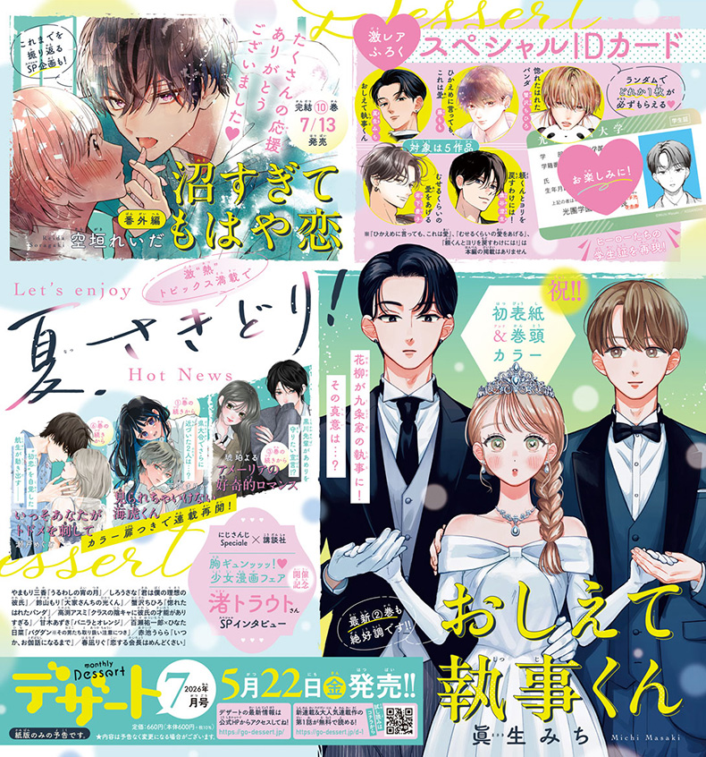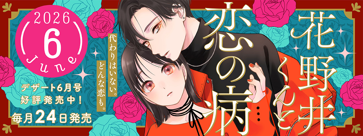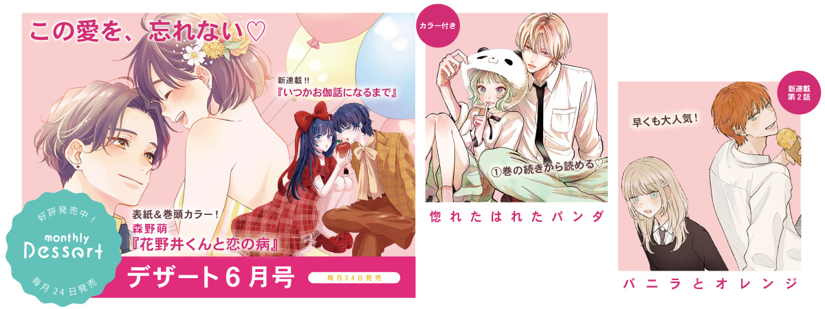 デザート6月号は23日発売!! 表紙&巻頭カラーで『花野井くんと恋の病』が登場★ 番外編シリーズがついに完結! 『惚れたはれたパンダ』がカラー付きで連載再開! さらに新連載『いつか、お伽話になるまで』がスタート!! 23日(金)発売です!26/04/19New!