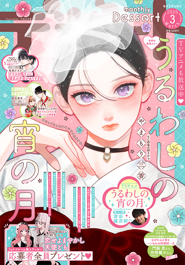 【デザート3月号✦本日発売】『うるわしの宵の月』が表紙&巻頭カラーで登場! 『恋せよまやかし天使ども』が⑥巻と連動で「フォトフレーム風ステッカー」がもらえる、応募者全員プレゼント開催(紙版限定)! 『頼くんとヨリを戻すわけには!』はカラー付きで連載再開&裏表紙で登場★ TVアニメ『うるわしの宵の月』からは、“宵パパ”を演じる津田健次郎さん撮り下ろしインタビューも!