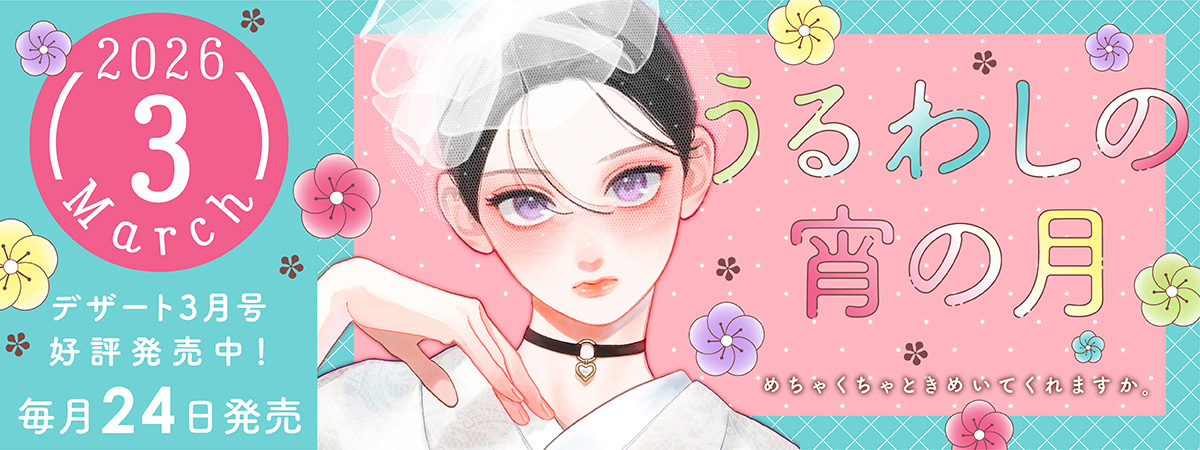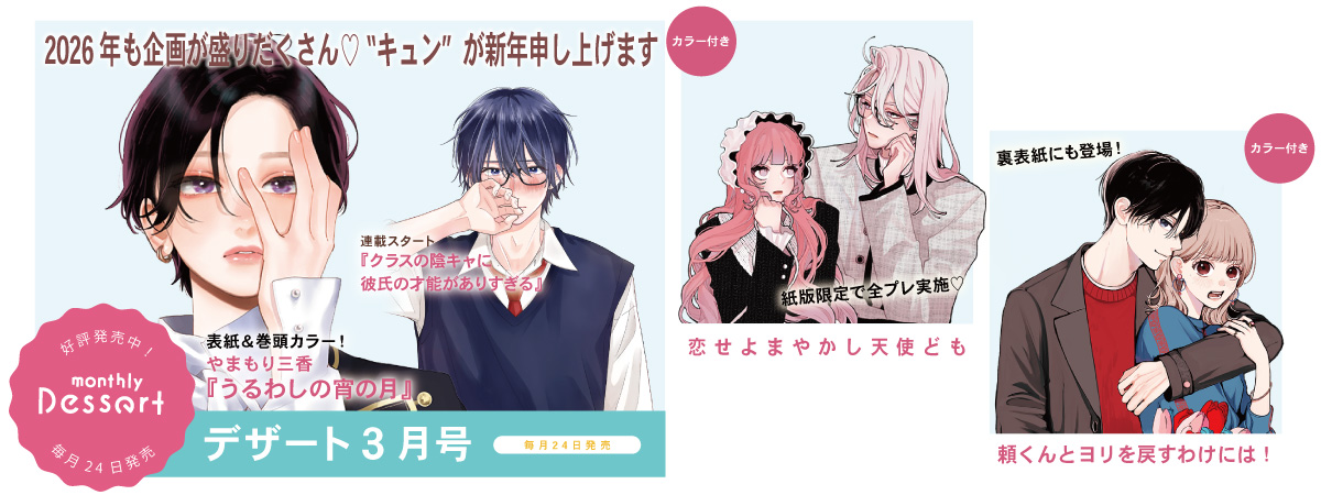 デザート3月号は23日発売! 表紙&巻頭カラーで『うるわしの宵の月』が登場★ 『恋せよまやかし天使ども』は⑥巻と連動で応募者全員プレゼント実施(紙版限定)!! さらに『頼くんとヨリを戻すわけには!』がカラー付きで連載再開&裏表紙に登場!! TVアニメ『うるわしの宵の月』からは、“宵パパ”を演じる津田健次郎さん撮り下ろしインタビューも!26/01/19New!